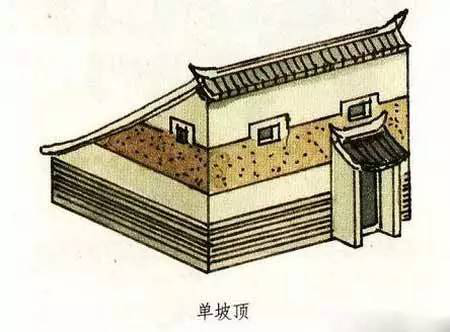 单坡顶就是只有一面坡的屋顶。它与我们常见的两面坡屋顶有较大的不同,但从一面来看又有极大的相似性。我们甚至可以说,单坡屋顶就像是两面坡屋顶被从中间一切两半了。单片屋顶一般都用在不太重要的建筑或是附属性的建筑上。在已发掘的商代宫殿遗址中,可以看到在商代即有单坡顶的廊子了。而现在的陕西、陕西等地的农村,许多民居仍然使用单坡式的屋顶,成为现今较富有特色的一种民居形式。