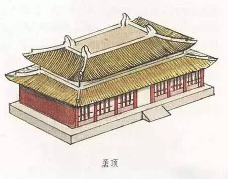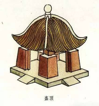 盝顶,是一种较为特别的屋顶形式。这种屋顶形式是在屋顶上有四条与屋檐平行的屋脊,四条屋脊构成一个长方形或正方形的平顶,其四角各有一条垂脊向下斜伸,共形成四块坡檐。盝顶这种顶式在古代大型宫殿建筑中极为少见。