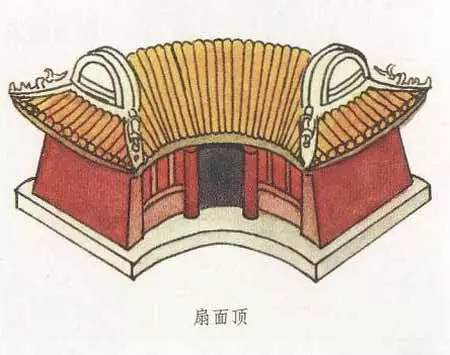 扇面顶和万字顶一样,是一种非常别致的屋顶形式,扇面顶顾名思义,就是扇面形状的屋顶形式,其最大特点就是前后檐线呈弧形,弧线一般是前短后长,即建筑的后檐大于前檐。建筑的西山墙的墙线若向内延伸,可以交于一点,而这一点就是扇形的扇子柄端。扇面顶的两端可以做成歇山、悬山,也可做成卷棚形式。扇面顶一般都用在形体较小的建筑中,会让建筑看起来更为小巧可爱。