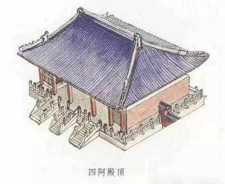 四阿殿顶也就是庑殿顶。四阿殿顶也是宋式叫法。“阿”是建筑屋顶的曲檐,“四阿”就是四面坡式的曲檐屋顶。庑殿顶共有五条脊、四面坡,所以叫做四阿殿顶。