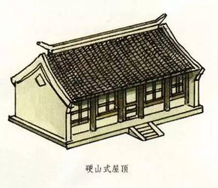 硬山式屋顶有一条正脊和四条垂脊。这种屋顶造型的最大特点是比较简单、朴素,只有前后两面坡,而且屋顶在山墙墙头处与山墙齐平,没有伸出部分,山面裸露没有变化。明、清时期及其后,硬山式屋顶广泛地应用于我国南北方的住宅建筑中。正因为它等级比较低,所以屋面都是使用青瓦,并且是板瓦,不能使用筒瓦,更不能使用琉璃瓦。