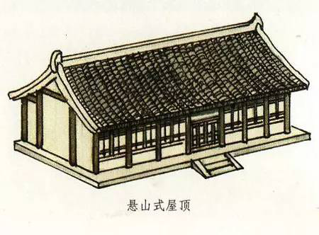 悬山式屋顶与硬山式屋顶一样有一条正脊和四条垂脊。不过,它又有不同于硬山式屋顶那样与山墙平齐,而是伸出山墙之外。这部分伸出山墙之外的屋顶是由下面伸出的桁(檁)承托的。所以悬山式屋顶不仅有前后出檐,在两侧山墙上也有出檐。悬山式是两面坡屋顶的早期做法,不过中国古代的重要建筑基本没有使用悬山式屋顶的,特别是唐代以前尤为少见。