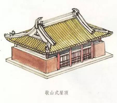 歇山是清式叫法,在清代之前它又有曹殿、汉殿、厦两头造等不同名称。歇山式屋顶在具体形式上又有最基本形式的单檐歇山顶,以及变化形式的二层、三层或多层屋顶的重檐歇山顶,还有最上面的屋顶可以不设正脊而形成卷棚式的卷棚式歇山顶等多种形式。