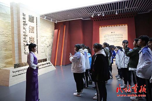 “废奴丰碑——西藏民主改革60周年特展”在北京西藏文化博物馆开幕。图为北京西藏中学学生参观展览