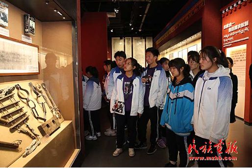 北京西藏中学的学生们看到旧西藏的各种刑具时,神情凝重