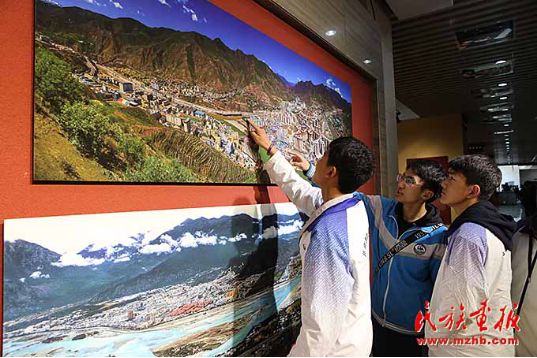 西藏中学的学生兴奋地在照片中寻找自己的家