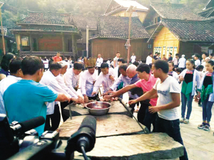 2016年9月1日(农历八月初一),贵州省从江县高增乡占里侗寨的男女老少同饮血酒,对石盟誓,重温祖先誓言。