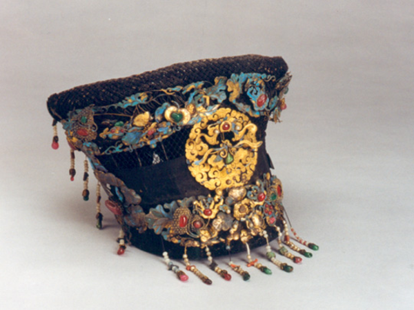 钿子是满清贵族妇女在节日和重要活动中所佩戴的一种彩冠。其状如平顶帽,前高后低,上穹下广,帽架用铁丝编成,外蒙黑纱,内衬棉布,上镶嵌珐琅、点翠花、宝石、珍珠等作为装饰。