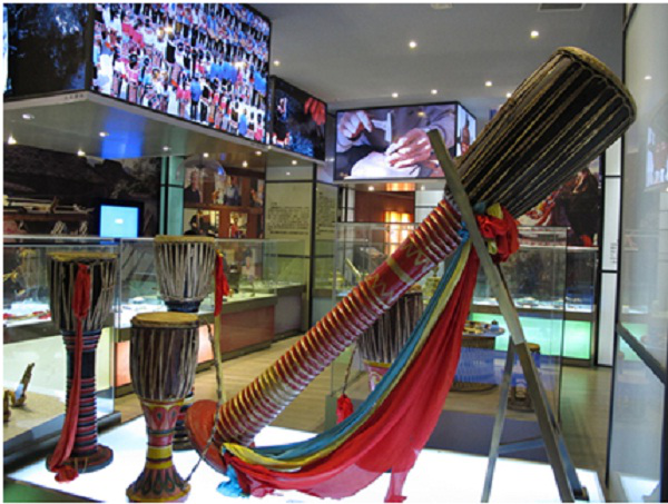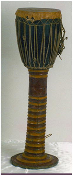 馆藏傣族木质象脚鼓为傣族民间传统打击乐器,座蹲型鼓。长182厘米、鼓面直径34.5厘米,年代为清代,征集于云南瑞丽。鼓身木质,鼓面为皮质,形似高脚杯,中空。主体分三个部分:上部(鼓头)呈上大下小的圆柱型,圆柱体长60厘米,大口直径34.5厘米,小口直径13厘米,鼓面蒙以牛皮,鼓身用牛皮绳编成网状加固;中部(鼓腰)呈圆柱体,柱长约90厘米,直径约10厘米;下部(鼓尾)呈喇叭形,底部直径40厘米,厚4厘米。通体分别用黑、黄、红色三色油漆装饰。
