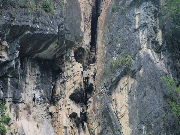 在以险见长的棉竹峡中,难以攀登的峭壁上溶洞遍布,巨大的石钟乳凌空倒悬,河床窄而落差大,4公里航道就有大小险滩30多处。乘舟漂流,全凭船工技巧,令人心跳砰然,却是有惊无险。