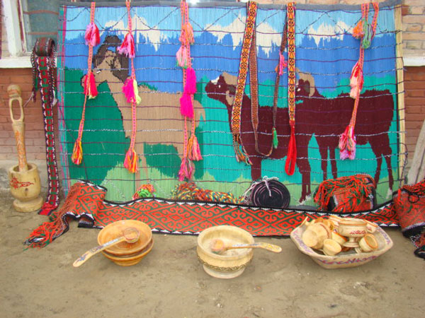 哈萨克族居住的毡房离不开芨芨草编织,芨芨草编织品可顺着毡房圆形的周围展开,既实用而美观,又能阻挡外来物的进入;也可用来装饰毡房内,使毡房内艳丽夺目,充满草原气息。