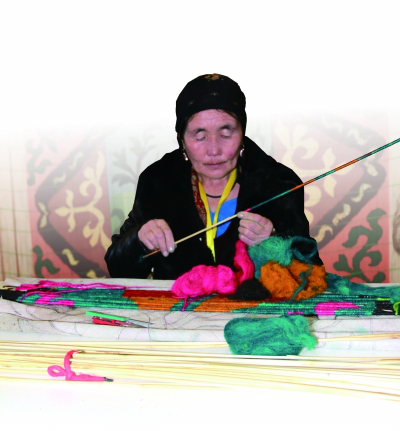 原料备好了,然后支起大锅烧开水,水开后放入各种花草和石头,再放进处理好的羊毛,烧煮一个小时。于是,那些花草和石头的原生态颜色,就自然地染在羊毛了。把着色的羊毛在阴凉处晾干后,妇女们拿来撕开,捻成各色的毛线。彩色毛线备好,开始编织了。编织的妇女在纸上绘好图案,把芨芨草放在图案上,用小刀或铅笔在芨芨草上划分出各个颜色的位置和间距。然后将各色的羊毛根据图案的要求,缠绕在芨芨草上,用这样的芨芨草将图案拼出来。这个编织图案的过程,是很细致的工序。将自己所需要的图案编完后,就用斧头等工具砍齐两头,一件编织物就完成了,哈萨克族人把它叫“琼木其”。最常见的“琼木其”宽一米半、长两米。要编织一件精美的芨芨草挂毯,要花上数十个甚至上百个工日才能完成。