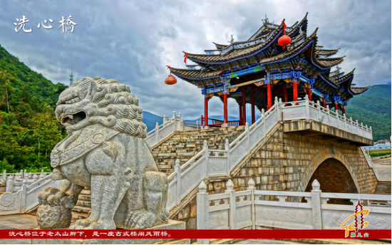 洗心桥位于老太山脚下,是进入鸡足山必经之处,建筑为一座古式楼阁风雨桥。传说以前鸡足山金华长老在这里用钵盂取水做法,为八个大盗洗净他们邪恶异色的心,让他们诚心悔过,改邪归正,放下屠刀,上山学佛。从此,人们就把这座桥称为“洗心桥”。