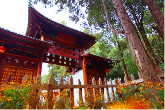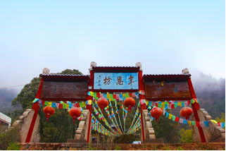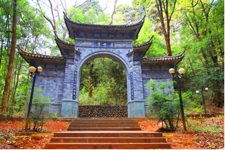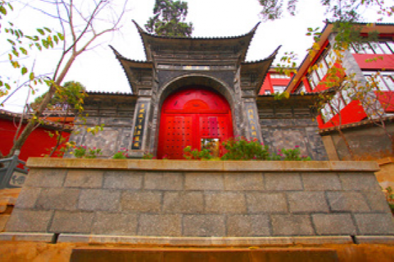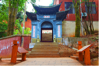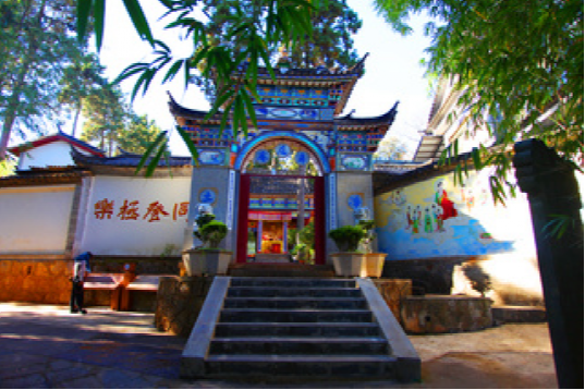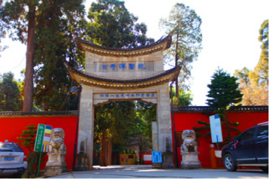 “灵山一会”牌坊,人们习惯称为“山门”,是进入灵山佛国、人间净土——鸡足山的大门。传说佛祖曾在这里给上百亿天人设坛,佛家就把这里叫做“灵山一会”。灵山一会牌坊始建于明万历年间,上世纪60年代被毁,1985年依原样重建。主坊上的前后两面,高悬原中国佛教协会会长赵朴初先生书题的“灵山一会”蓝底金字大匾,和两块同出于先生手笔的蓝底金字竖匾,前为“天开佛国”,后为“地涌化城”。牌坊前面两边的楹联:“梵钟声彻三千界,鸡足名标第一山”,道出了鸡足山在佛教名山中的重要地位。