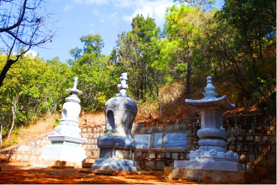 静闻墓,位于鸡足山文笔峰下的苍松翠柏之间。静闻是江阴迎福寺僧人,刺指血抄写了《法华经》一部,发愿供奉鸡足山。明崇祯九年,与徐霞客结伴西游,不料湘江遇盗,静闻受伤落水,他不惜生命,将《法华经》高擎于顶,以免水湿经损。到广西南宁时,连病带伤,不幸在崇善寺去世。病重期间拜托徐霞客:“我志不得达,死愿归骨于鸡山。”徐霞客悲痛万分,背着静闻的遗骨,行走5000多里,1638年冬来到鸡足山,在文笔山埋下静闻遗骨并建塔,将《法华经》供奉在悉檀寺。岁月沧桑,墓塔成了荒丘。如今的静闻墓塔,是1988年纪念徐霞客登鸡足山350周年之际,在原墓址恢复修缮的。墓塔后石壁上刻有徐霞客悼念静闻的诗文及徐霞客与静闻的故事。