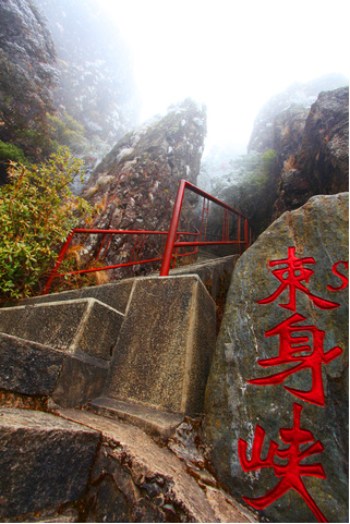 束身峡离金顶寺约500米,两座陡峭的石壁如刀削斧砍,相对怒视,置身中间仅有一线之隔,游道就从这里穿过,狭窄奇险。游人来到这里至此只能一个人通过,在里面抬头仰望,青天犹如一条细细的线,石壁之上怪石嶙峋,好像就要掉下来一样,惊心动魄,所以人们把这里叫“束身峡”。